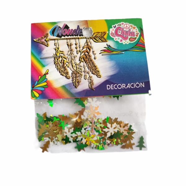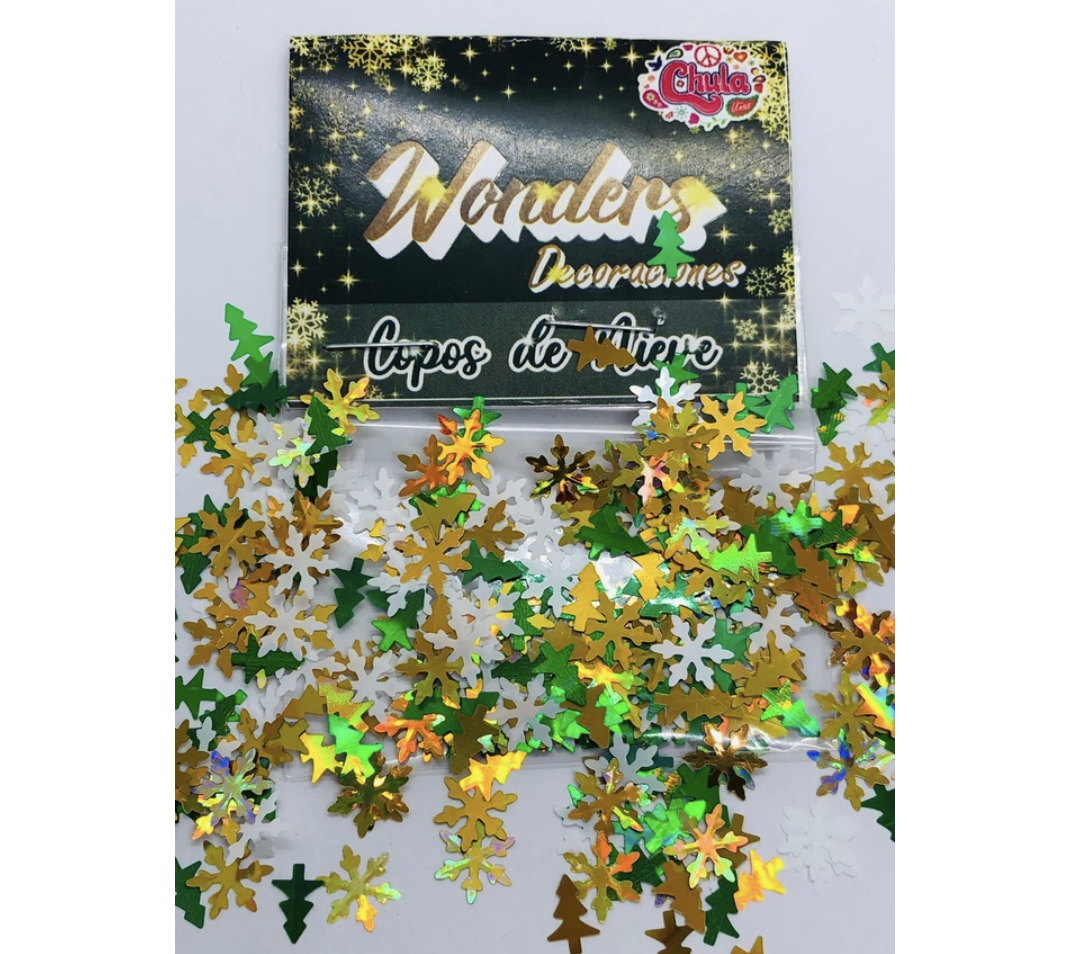 Ideal para diseños navideños y de temporada, este mix incluye copos de nieve y arbolitos navideños en tonos dorado, verde y blanco con acabado tornasol que brilla con cada movimiento. ¡Perfectos para crear uñas que griten “felices fiestas”!
