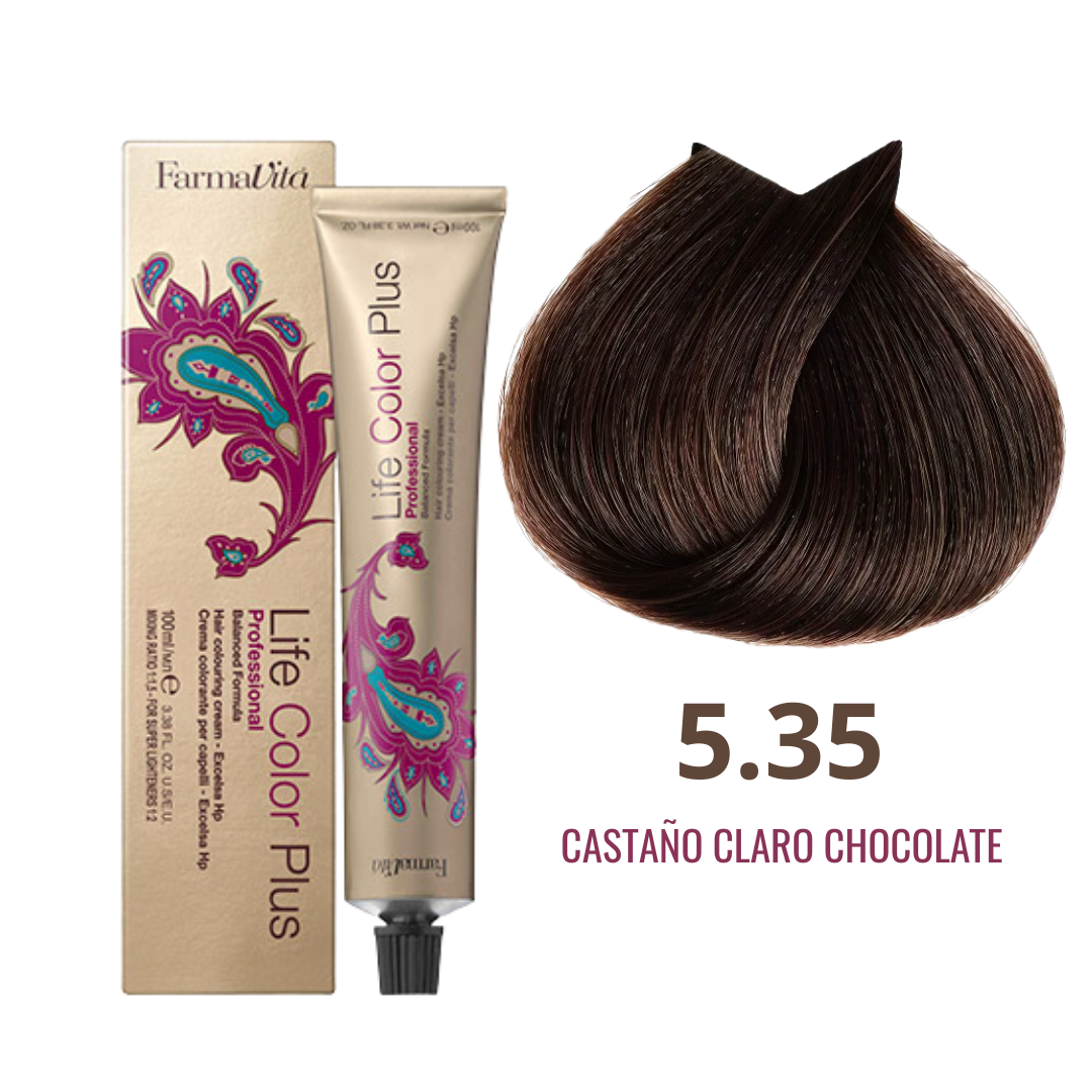 Tintura permanente Life Color Plus 5.35 Castaño Claro Chocolate. Color intenso, uniforme y duradero con excelente cobertura de canas.