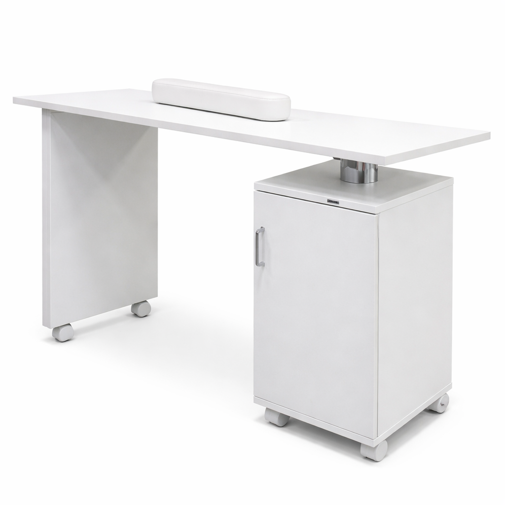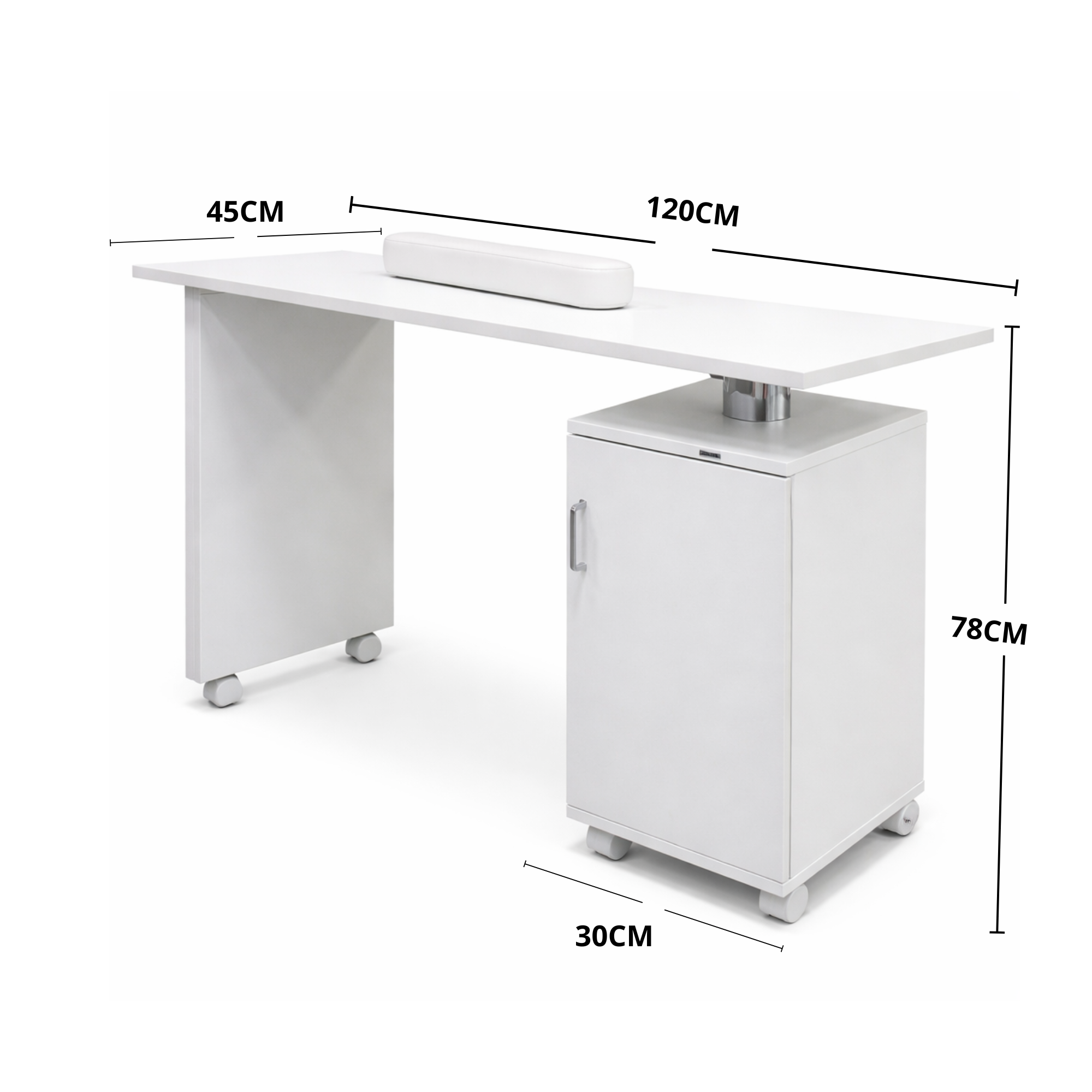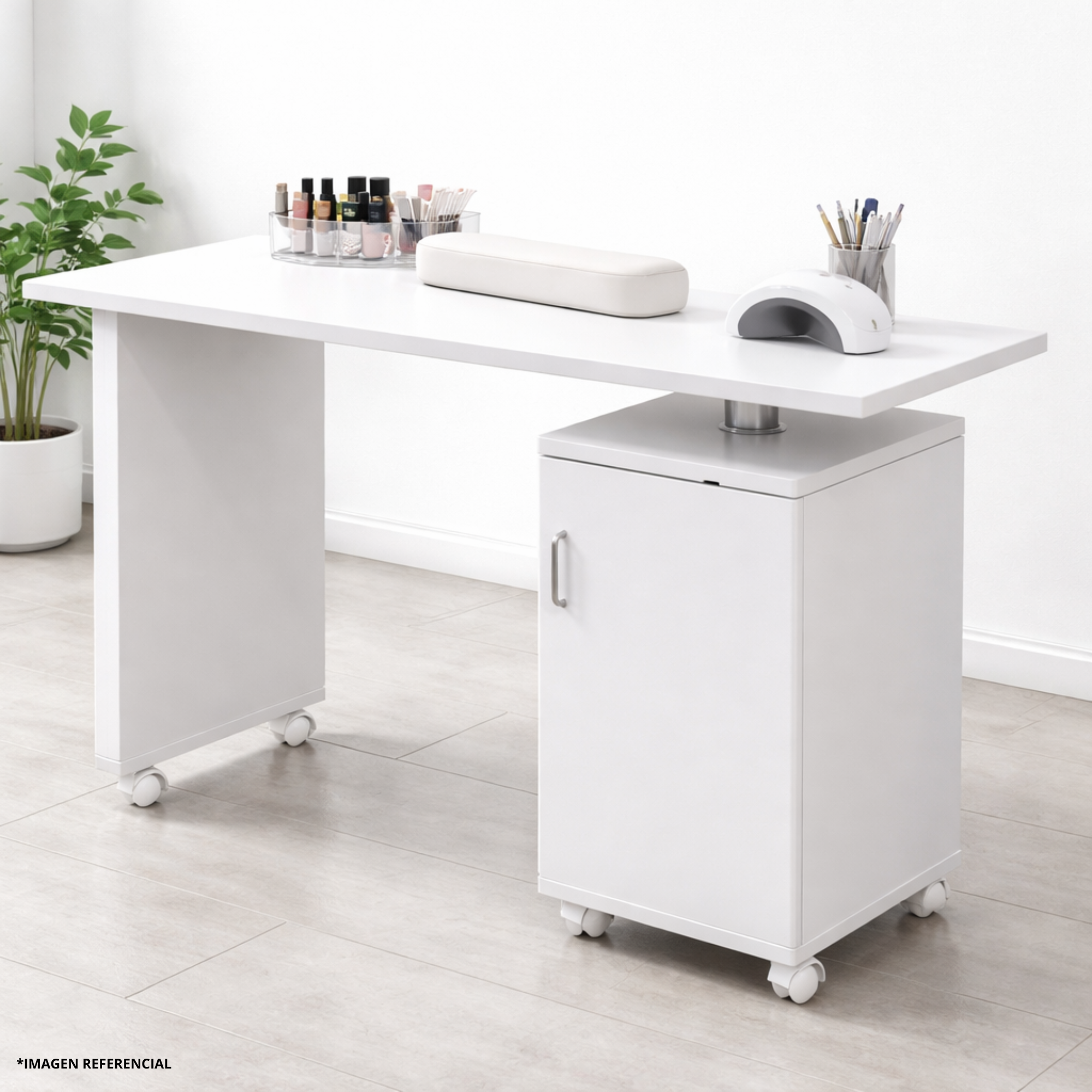 Mesa de manicure profesional MT-227 con diseño moderno, superficie amplia de trabajo, gabinete lateral con puerta y ruedas para fácil movilidad. Ideal para salones de uñas, centros de estética o uso profesional.