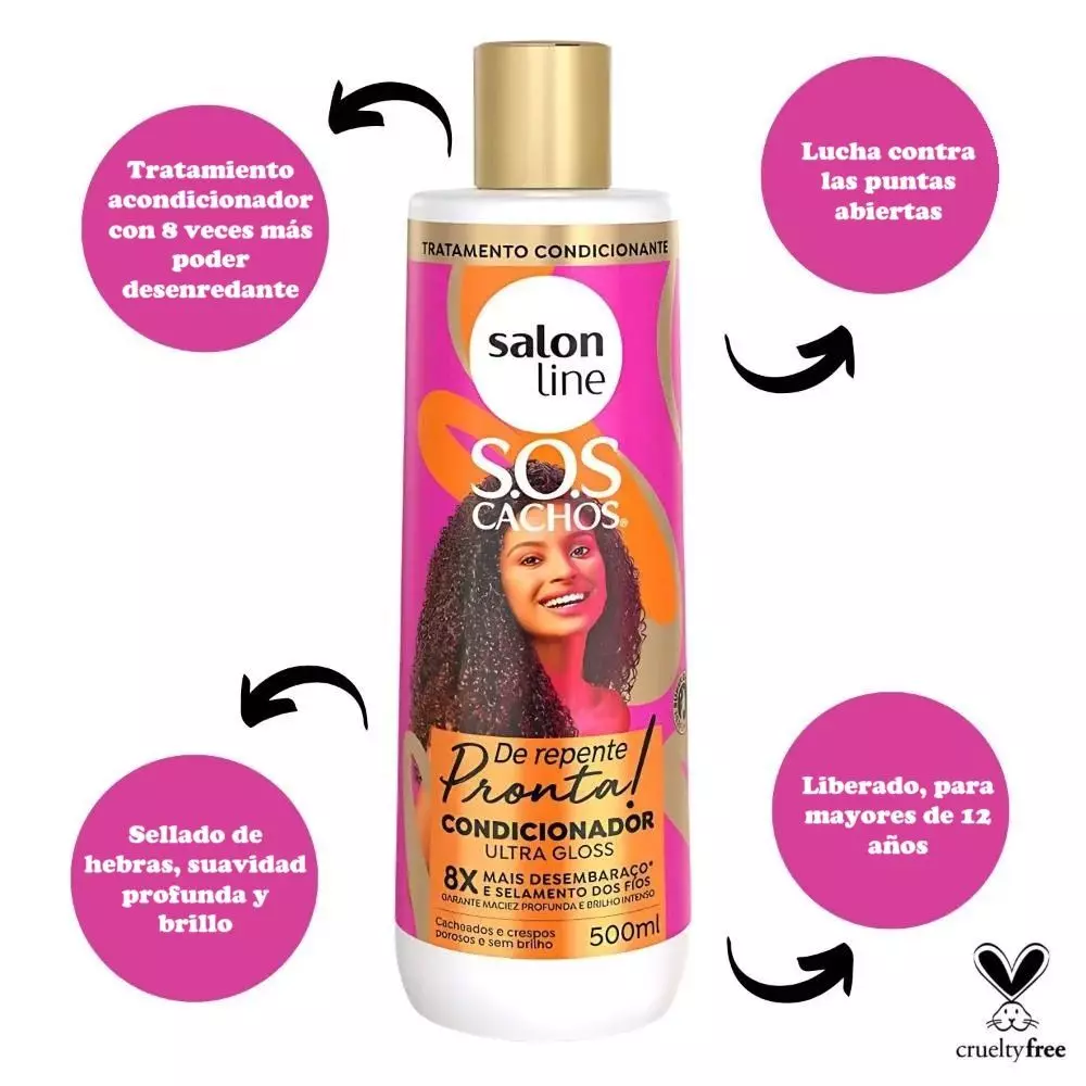 Acondicionador Ultra Gloss SOS Rizos: 8x más desenredo, suavidad profunda y brillo intenso. Fórmula vegana con óleos nutritivos y extracto de frambuesa.